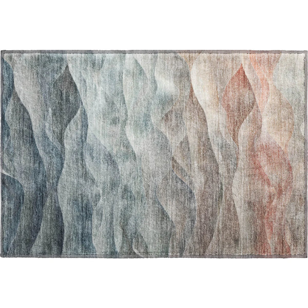 Soft, undulating lines create the look of gentle ocean waves in a harmonious blend of teal, blue, copper, gray, and silver. The design evokes shifting tides at sunrise, balancing cool coastal tones with warm highlights for a peaceful, contemporary statement. Both artful and versatile, it brings quiet elegance to living rooms, bedrooms, and covered patios alike.